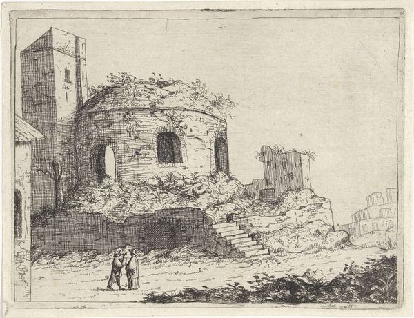 Curator: Welcome. We're standing before Willem Matthias Jan van Dielen's "Zuidelijk landschap met ruïne en herder met vee," created between 1815 and 1867. It's a captivating etching. Editor: My immediate reaction is one of solitude and perhaps melancholy. The stark contrast of light and shadow, combined with the crumbling ruins, evokes a sense of time passing. Curator: Indeed. Van Dielen employs etching to masterfully convey a landscape steeped in historical context. We see a ruined building in what appears to be a classical style—the arches, the suggestion of a once-grand structure. Editor: Note how the use of line creates depth and texture. The density of the marks, particularly in the foreground and the ruins themselves, makes them seem almost tactile. It gives them physical weight. Curator: Absolutely. And the contrast in line quality, from the rough, hurried marks delineating the vegetation to the finer, more deliberate strokes defining the architecture, highlights the scene's inherent tension between nature and culture. This aesthetic resonates with the Romanesque movement and its interest in historical and landscape subjects. Editor: The presence of the herder and his livestock is critical; it grounds the grand ruin within a cycle of daily life and the natural world. In light of sociopolitical movements in Europe and a newfound interest in historical societies during this period, pastoral imagery was being politicized as representing a more "pure," or localized cultural identity. Curator: Precisely. And that subtle interplay creates an allegory where both pastoral and historical elements converge. Note, too, how the eye is drawn into the composition through the apertures and into imagined realms of the former structure. Editor: I find the size fascinating as well, knowing this is an etching it provides an intimacy with such expansive themes. Curator: The artist provides not just a picture, but a carefully constructed commentary on how people build worlds that rise and fall. And we now engage with its echo through his art. Editor: Reflecting on this piece, the ruin isn't just a fragment of a building, it represents the layers of time. Its haunting beauty persists as we observe, bearing testament to history and natural forces.