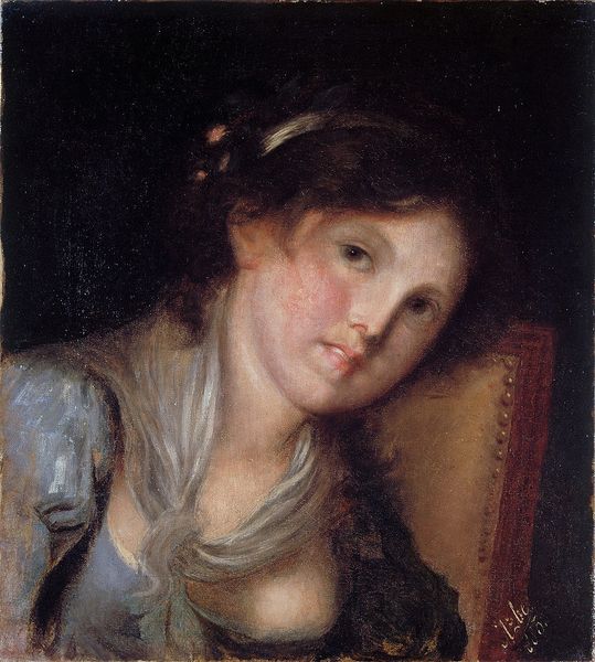 Editor: Here we have Gustave Courbet's "Portrait de Zélie Courbet" from 1842, rendered in oil on canvas. There’s something quite delicate about it, almost melancholic. What strikes me is the incredibly smooth surface; how was that achieved at this time? Curator: The smoothness is key, isn’t it? Courbet, even this early, is grappling with representation. The almost porcelain-like skin is achieved through careful layering and blending of the oil paint, which involved labour but it hides it, doesn’t it? But look at the way her clothing seems secondary, the texture of the fabric is only gestured towards. Editor: I see what you mean. There is an imbalance in how she’s presented... the emphasis on her face seems idealized, even. Curator: Precisely! Now consider the social context. Portraits like this were often commissioned, aren't they? Think of the Courbet family and their resources: where would Courbet have learnt painting skills at that moment of history? What materials were available to him? This idealisation is less about pure aesthetics, and more about reflecting or constructing social standing. This piece makes us ask whose idea of beauty is portrayed? Editor: So it’s not just a portrait, it’s a statement of the Courbet's own bourgeoise status, made using the tools and values available to them. I hadn't thought of the availability of the paints themselves being so critical to understanding this. Curator: Exactly! We understand art best when we look at its creation and what that production meant. Editor: It makes you rethink what you value when looking at art. Thanks. Curator: Indeed, and that’s precisely what a materialist reading encourages: to think critically about the relationship between production, art, and society.