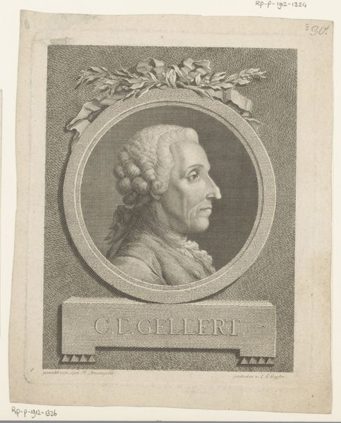 This is "Portret van Georg Friedrich Seiler", an engraving by Christian Gottlieb Geyser, housed in the Rijksmuseum. The immediate experience of this portrait is one of classical order and balance, achieved through its structured composition and restrained palette. The oval frame, adorned with a ribbon, encloses the subject, Georg Friedrich Seiler, creating a sense of containment and focus. Below, a rectangular plaque displays Seiler's name. This rigid geometry contrasts with the soft, diffused lighting on Seiler's face, drawing us into his gaze. The very structure of this portrait is a sign. The oval, the rectangle, the font, and the carefully modulated tones all speak to the Enlightenment's emphasis on reason and order. Yet, the subtle gradations of light and shadow hint at the complexities beneath the surface. The portrait invites contemplation of the relationship between external form and internal character, echoing broader philosophical inquiries into representation and identity. This work reminds us that every artistic choice—from line to shadow—is imbued with cultural and philosophical meaning.
