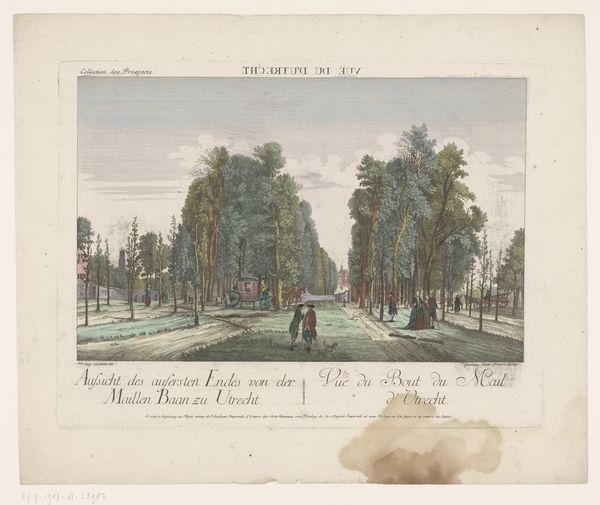 Carel Christiaan Antony Last created this print, "Paviljoens aan het Malieveld in het Haagse Bos," using etching techniques. At first glance, we see a symmetrical composition dominated by tall trees framing a path. The trees, rendered with fine lines, create a textured canopy overhead, inviting the viewer into the scene. Notice how the path narrows, leading the eye towards distant figures and structures, creating depth. Last’s use of perspective here isn't just representational, it structures the entire visual field. Consider the interplay between light and shadow. The subtle gradations give form to the trees, the soft light filtering through the leaves evokes a tranquil atmosphere. This isn't merely a depiction of nature; it's an exploration of how light shapes our perception and understanding of space. The print engages with the 19th-century interest in landscape and its philosophical implications. The composition challenges us to think about the relationship between nature, representation, and the gaze. As you continue, consider how such formal elements reflect and refract broader cultural and philosophical concerns.