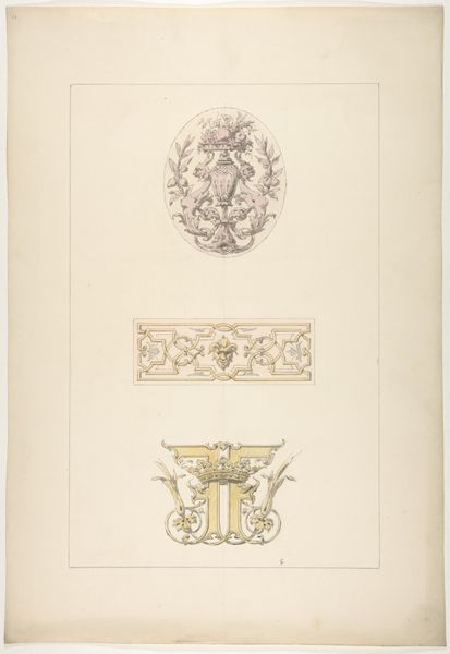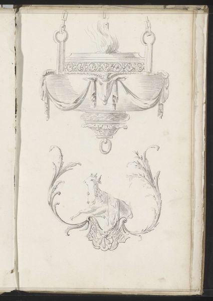 This undated sketch, "Ornament met vazen, mascaron, bladeren en figuren", was created by Jacob Toorenvliet, using what appears to be graphite on paper. During the 17th and 18th centuries, decorative arts played a crucial role in signaling social status and cultural sophistication. Toorenvliet's drawing encapsulates the period’s obsession with classical motifs and lavish ornamentation. The symmetrical arrangement featuring vases, leaves, and figures reflects an idealized vision of elegance and order, reminiscent of ancient Roman aesthetics, which were themselves built on Greek archetypes of power and beauty. The sketch blends mythological and natural elements, with figures that appear to be nymphs, satyrs, or cherubs. The work also integrates symbols of abundance and fertility, seen in the overflowing vases and foliage. This ornamental style can also be viewed as a form of cultural storytelling, reflecting the aspirations and values of its patrons.
