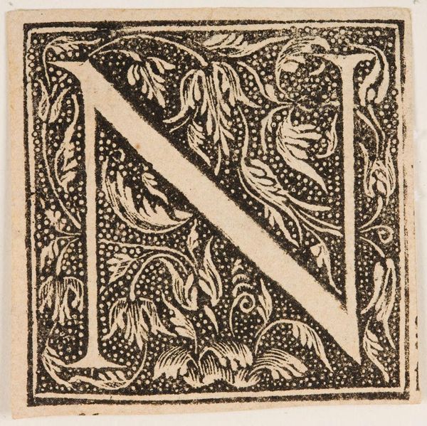 Curator: This woodcut, titled "Letter M," is from an unknown artist, and it resides here at the Harvard Art Museums. The anonymous nature of this piece speaks to a fascinating history of craft production. Editor: I'm immediately drawn to the stark contrast between the letter and the background. It's simultaneously bold and delicate, with those intricate floral details. Curator: Exactly. Consider the socio-cultural context: illuminated letters like this were often part of larger illuminated manuscripts, demonstrating wealth and status. Editor: And power. Who held the power to commission such works, and what messages were they reinforcing through these images and texts? The "M" could stand for so much more. Curator: Indeed. The visual language is deliberately constructed to communicate specific values and maintain social hierarchies. Editor: Looking at it this way, even a seemingly simple letter becomes a potent symbol, filled with layered meanings that we need to unpack critically. I wonder what "M" means to them? Curator: A letter, like many other works, can be a window into understanding the priorities of a culture. Editor: Absolutely. It underscores the importance of examining art through a lens that acknowledges the complexities of representation.