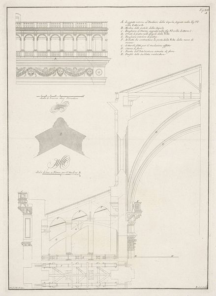 Johannes Cornelis Zürcher created this drawing of Roman architecture, using delicate lines to illustrate architectural forms. The composition is divided into sections, each presenting a different elevation or detail of classical structures. The linear quality of the drawing highlights the precision and order inherent in Roman architectural principles. Zürcher's detailed rendering invites us to examine how classical forms are constructed from basic geometric shapes. There's a certain structuralist approach, with its emphasis on underlying systems. Each line, each carefully measured space, functions as a sign pointing to a larger system of architectural language. Classical architecture embodies the cultural values of order, reason, and durability. Zürcher's drawing captures and translates these values into a visual medium. His rendering is not just a depiction but an interpretation of a system of meaning. Notice, in closing, how the drawing's structure echoes the architectural structures it depicts. This reveals how form is not merely aesthetic, but an embodiment of cultural and philosophical ideas.