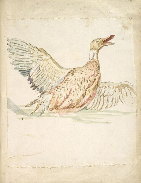 Editor: Here we have Jean-Baptiste Oudry's "Standing Bird Looking Right." It looks like watercolor and ink on paper. The way the bird's rendered, it almost feels like a study of texture. What strikes you about this piece? Curator: The paper itself is crucial. Look at its age, its weave. Oudry was working in a time of intense material exchange. Where did this paper come from? Was it local, or imported? This informs our understanding of the piece. Editor: So, the very materials tell a story beyond just the image itself? Curator: Precisely. The labor involved in creating the ink, processing the paper, and Oudry's own training—it all speaks to a complex web of production and consumption. What do you think? Editor: That's a fascinating perspective. I'll definitely be thinking more about the materials used in artworks from now on.