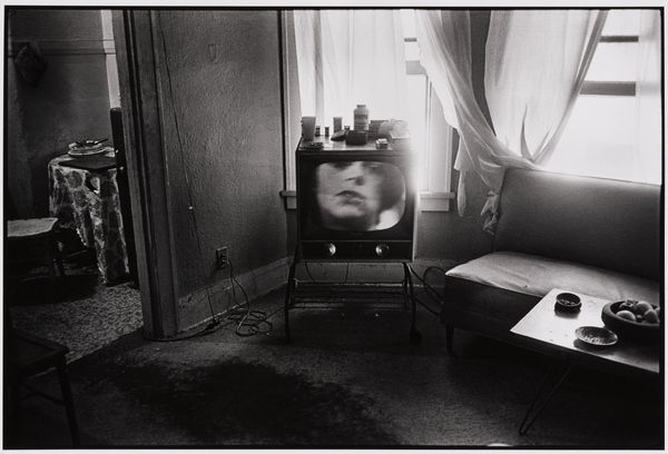 Editor: So, this is Dennis Feldman’s black and white photograph, "Ellamore, West Virginia." It feels incredibly intimate, almost voyeuristic, like we're intruding on this boy's private world. What stands out to you? Curator: It's striking how Feldman captures the intersection of private and public spheres. The boy, seemingly unposed, sits amidst a carefully arranged domestic interior. But the television, a portal to the outside world, dominates the scene, and raises the question of how media shapes identities, especially in rural communities like Ellamore. Editor: That's a fascinating point. I hadn't considered the TV as a character in itself, influencing the boy’s perception. Curator: Exactly. Think about the composition: the boy is framed by both the domestic space and the broadcast image. Feldman prompts us to consider the cultural forces at play in shaping individual consciousness. This resonates with the history of documentary photography and its role in representing social realities. Editor: I never would have noticed all that! It gives the image so much more depth. Thanks! Curator: It is about the interplay between the individual, their environment, and the pervasive influence of mass media. A great lesson.