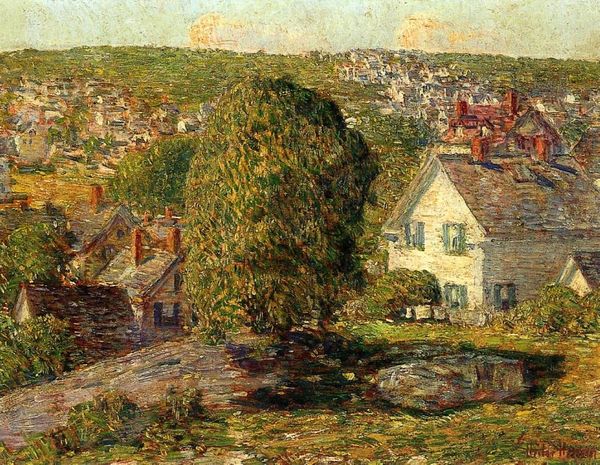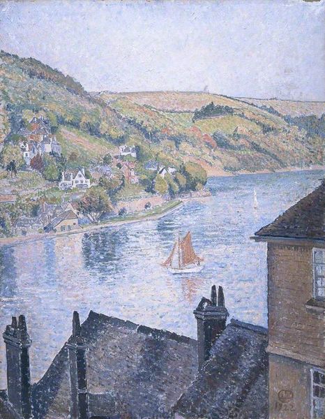 Editor: This is "Dartmouth" by Lucien Pissarro, painted in 1922 with oil on canvas. It gives us this incredible view overlooking the town. The pastel shades and hazy atmosphere create a very serene and dreamlike quality. How do you interpret this work, especially in light of its historical context? Curator: It's interesting to consider how Pissarro, as the son of Camille Pissarro, engaged with and diverged from impressionistic traditions. We see here a softening of the typical, more vibrant, impressionist palette. Considering the period after the First World War, with its shifts in social structures and artistic ideals, this softening could represent a yearning for pre-war tranquility, don't you think? How do you see this landscape interacting with the rise of modernism at the time? Editor: That’s a great point. I guess I was just seeing the idyllic imagery, the kind of nostalgia for simpler times you’re talking about. But modernism was gaining momentum, with artists exploring abstraction and challenging conventional representations. This feels very different, almost a retreat. Curator: Precisely! The choice to depict a town, rather than, say, a rapidly industrializing city, suggests a specific kind of engagement with modernity – one that seeks refuge in the pastoral. Where does Pissarro situate the viewer in this scene, and what impact might this choice have on the work's reception? Editor: We're positioned quite high up, looking down on the town. That feels intentional. Maybe to create a sense of detachment or overview, commenting from a distance? Curator: Perhaps, but it also mirrors a position of privilege – both literally and figuratively. It's a vantage point accessible only to those with the means to acquire such a view. This highlights the role of art in shaping perceptions of landscape and its relationship to social standing. Editor: I see what you mean. So, it's not just a pretty landscape. It is reflective of social hierarchies? I never thought of Impressionism that way. Thanks, this really changed how I looked at it. Curator: Exactly. It prompts us to consider not just *what* is depicted, but *who* is doing the depicting, and *why*. I found that context enriched my reading immensely too!