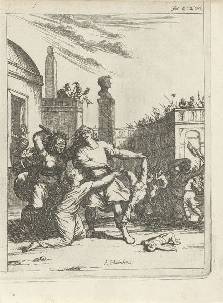 Editor: This etching is titled *Krijgsman bij een heks,* or Warrior with a Witch, and was made by Arnold Houbraken between 1681 and 1699. The composition looks so turbulent; a swirl of figures rendered in a mass of crisscrossing lines. How would you interpret this visually? Curator: If we consider it simply as a composition of line, tone, and form, irrespective of subject, we see a carefully organized space. Note how the lines, dense in areas of shadow, dissipate to create highlights and delineate forms, all of which guides the viewer's eye in a carefully orchestrated dance. Observe the architectural arch at the top right; a strong contrast is established. Editor: The details are remarkable – from the wizard's books to the winged figure whispering into the warrior's ear. There's a circular design on the ground where the characters are placed. Is there some sort of structural relationship happening here? Curator: Precisely. Consider that circular design, as you call it, within which most figures are situated. It acts as a frame within the frame. What about the direction of figures? You have characters angled left, characters angled right. An interchange happens within the formal pictorial structure. Note also the tonal structure from upper-left to bottom-right – this contrast generates considerable spatial recession, a defining element in the Baroque idiom. The surface and its elements, irrespective of symbolic narrative, all convey information of intrinsic structural relevance. Editor: I see. So, it’s not just about the *story*, but the visual language itself? The artist composes it as part of a complete piece. Curator: Indeed. The linear interplay is carefully constructed to guide the eye. The light, while dramatic, is meticulously applied to highlight key formal elements, creating rhythm and depth. This formal orchestration elevates the print beyond mere illustration. Editor: This has completely altered how I viewed this print. I now see it as much more than just figures enacting a narrative; the composition creates its meaning, and the narrative just adds an element. Curator: The symbolic meaning is constructed through a delicate equilibrium of form. Once we attune our perceptions to this truth, we can start to engage art with genuine depth.