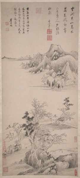 Curator: Here we have a work titled "Landscapes" created by Dai Xi around 1848. It's a pencil sketch, using ink on paper, and is currently held here at the Metropolitan Museum of Art. Editor: It's hauntingly beautiful. The delicate strokes, almost faded, give it such a melancholic feel. It’s like a memory surfacing from a dream. Curator: It's very much within the traditional Chinese landscape painting aesthetic. Note how the artist used empty space, particularly the large blank area above the mountains. This negative space isn't just a void; it actively contributes to the work's depth, implying vast distances and atmospheric perspective. Editor: That emptiness is doing all the work, isn't it? Like a quiet breath before a storm. Those mountains almost disappear into the mist, they are like pale ghosts or frozen mirages in the distance. It does not have the strength and vitality like mountains in landscape painting, instead it reflects weak melancholy and sad beauty. Curator: Precisely. The work's cultural context also affects our reading, because this composition would be rooted in specific philosophical ideas that emphasize harmony between people and nature. Editor: Harmony... yes, I see that, but with a touch of longing, wouldn’t you say? I mean, look at the bare trees. They’re elegant, of course, but so vulnerable. There is this kind of bleak beauty and a loneliness inside it that attracts my feelings. It almost makes me sad just thinking about the trees alone. Curator: It is an intimate engagement with nature—perhaps offering viewers an escape. But what the piece signified back then depended significantly on social circumstances, particularly access to this piece: who saw it and where. Those aspects frame the impact and meaning of a work immensely. Editor: Makes you think, doesn't it? Did people then respond similarly? Is it just ink and paper…or does it possess something? A collective emotional memory embedded in it that allows the beauty of this sadness and bleakness still exist today? Curator: Food for thought indeed! Thanks for your impressions! Editor: Likewise. This image has changed my perspective on East-Asian landscapes for good!