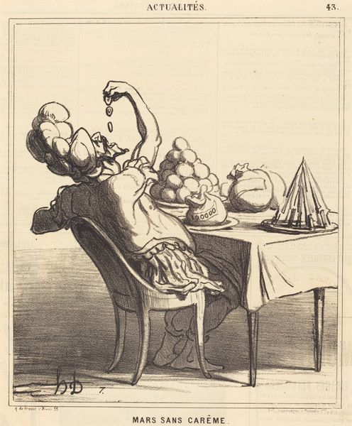 Curator: This is Honoré Daumier's print, "Commerce: 'So, when...'," currently housed at the Harvard Art Museums. It depicts a game being played, lit by a single candle. What catches your eye? Editor: The etching's stark contrast immediately creates a darkly comic atmosphere. Note how the angular lines emphasize the caricatured features, exaggerating the players' expressions. Curator: Indeed. Daumier, known for his lithographs commenting on 19th-century French society, often used printmaking to reach a wide audience with critiques of the bourgeoisie and political figures. Editor: Looking at the composition, the positioning of the characters – the waiter hovering, the players intensely focused – creates a hierarchy reflective of the social commentary you mentioned. Curator: The rapid strokes and sketchy quality speak to the urgency of his message. The materials themselves, inexpensive and reproducible, democratized access to social critique. Editor: Agreed. The raw, almost unfinished quality lends an immediacy to the scene. It feels less like a polished artwork and more like a snapshot of a moment in time. Curator: Ultimately, the effectiveness lies in its accessibility, both materially and conceptually. Editor: Yes, the simplicity of form carries a potent message, a stark commentary laid bare.