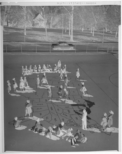 Curator: This photograph, simply titled "Untitled (three lines of ballet dancers practicing outside with teacher)" is by Jack Gould. Editor: There is a strange, ghostly beauty to it. The inverted tones lend an ethereal quality, making the dancers look like spirits in a sun-drenched purgatory. Curator: Precisely, it's worth noting the lack of specific date. This absence allows us to consider the image not as a snapshot of a particular moment but more as a representation of ballet as an art form. Editor: The extended arms in second position evoke the cross, a symbol of sacrifice and suffering, but also of balance. Curator: Ballet, born of courtly display, evolved, of course, into an emblem of bourgeois accomplishment, especially for women, so that could be at play as well. Editor: Yes, and even with the teacher seemingly dressed in street clothes, there is a rigid formality. Ballet is a dance of precision that is echoed through the three perfect lines. Curator: Thinking of the context of the Harvard Art Museums, it makes you think about the socio-economic status of the students. Editor: I agree. It leaves you wondering if they knew that someday their dedication would be immortalized in an art museum.