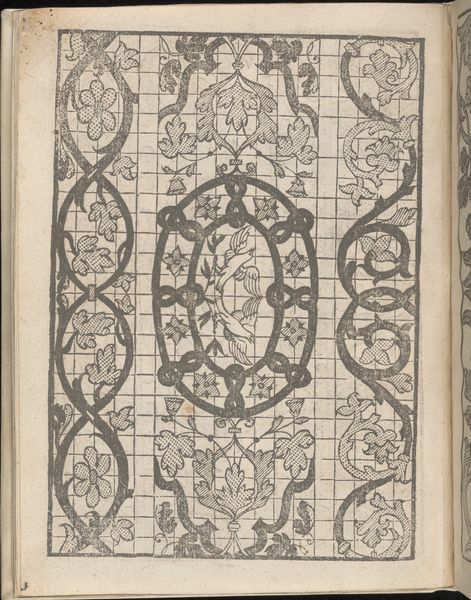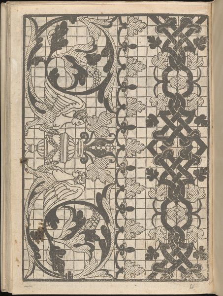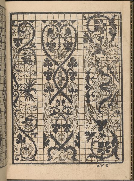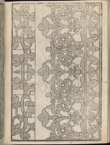 This is page 13 from "Splendore delle virtuose giovani," created by Iseppo Foresto around the mid-16th century. The dominant visual experience of this print comes from its intricate patterns and the stark contrast between black ink and the white of the page, lending the image a crisp and precise quality. Notice how the composition is neatly divided into vertical bands, each filled with different motifs ranging from flora to human figures. Foresto uses a grid structure in one of the bands which introduces a modern element to a classic design. The lines are both a structure and a disruption. They create order, yet undermine the natural flow of the organic elements. This interplay between order and chaos is central to understanding the deeper semiotic structure of the work, which seems to challenge fixed meanings. Through its complex patterns, the page destabilizes traditional notions of Renaissance art and hints at a more abstract and conceptual approach. The work operates on a cultural and philosophical discourse, where the act of viewing becomes an act of interpretation.
