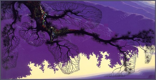 Here we see "Mountain Rise," a painting by Eyvind Earle. The immediate impression is one of verticality, with layered mountain ridges ascending into a misty atmosphere, crowned by an ancient tree. Earle masterfully employs line and texture to create depth and a sense of the sublime. Notice how the parallel lines etched into the mountainsides lead the eye upward, mimicking the tree’s upward struggle. The tree itself, rendered in shades of deep purple, stands in stark contrast to the muted blues and whites of the landscape, drawing our attention to its form and the delicate tracery of its branches. This contrast destabilizes traditional landscape painting conventions. The tree functions almost as a calligraphic sign, an emblem of resilience against a backdrop of geological grandeur. Earle seems to be pushing beyond mere representation to explore how line and color can convey meaning. This elegant construction suggests that nature’s beauty is found in its underlying structure, which invites a deeper meditation on our place within the environment.