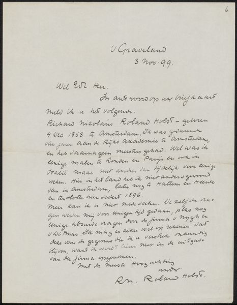 Curator: Here we have Richard Nicolaüs Roland Holst’s "Brief aan Willem Bogtman," dating probably from 1923 to 1926. It's ink on paper. Editor: It feels very personal, almost like peeking into someone's thoughts. The handwritten nature gives it an intimate feel. What catches your eye in terms of its formal elements? Curator: I'm struck by the distribution of text across the page. Note the contrast in densities – clusters of writing interspersed with relatively blank spaces. The artist uses this to create a visual rhythm. How does this compositional choice affect your perception? Editor: It definitely breaks up the text. My eye doesn't just scan it linearly. The placement gives each phrase or idea a sort of visual weight, setting off a contrast between different statements and points. Curator: Precisely. And what about the varying weights and styles of the lettering itself? Consider the semiotic potential within that choice. Editor: It gives an idea of an unfolding thought. As he's working, certain words may carry more significance in one moment than another, changing with the meaning as he sets out the intentions. How can we use that information to read its form in a contemporary manner? Curator: Well, consider that each stroke contributes to a unique visual language, and reflects on the inherent expressive capability present when constructing his intention and design, while adding to the drawing an image of layered meanings with shape, shadow and text all unified. Editor: So it’s not just about legibility, but the pure form of the mark-making itself. I suppose what you could extract is how you read and represent the author and his drawing. Curator: Precisely, leading us to understanding the pure essence of visual thinking in the work of Roland Holst, a very illuminating connection. Editor: I appreciate the idea of reading this not just for content, but also for the very deliberate distribution of visual textures.
