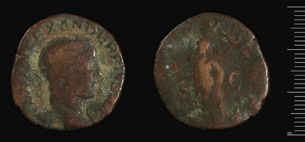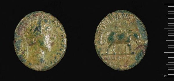 Editor: This is a sestertius of Philip I from Rome. The portrait is worn, but you can still see the strong profile. What symbols do you think are represented here? Curator: The Emperor's portrait on coinage always holds symbolic weight, acting as a direct representation of Roman power and authority. The other side looks like an altar, connecting him to the divine. Editor: So the coin broadcasts not just Philip’s image, but also his connection to Roman history and the gods? Curator: Precisely! Every element is carefully chosen to convey a specific message, reinforcing cultural memory. It also has the interesting effect of connecting currency with culture. Editor: That is fascinating; I never thought of coins as cultural symbols. Curator: They are potent symbols of Roman power.