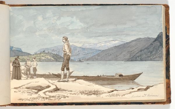 Editor: We're looking at Martinus Rørbye’s "Lake Landscape with a Rowing Boat. The Fiord Krøderen, Norway," created around 1830. It's a watercolor, seemingly done en plein air. There's a quiet, almost melancholic feel to it, with soft blues and greens. What do you see in this piece from your perspective? Curator: It’s fascinating to consider this watercolor within the broader context of 19th-century landscape painting and its relationship to national identity. Works like this played a key role in constructing and circulating notions of "Norway" – its untouched nature, its simple life. Does this image fit within a larger artistic trend? Editor: Absolutely. It seems tied to Romanticism, with its emphasis on the sublime and emotional connection to nature, though I wonder about its contribution to nationalism. Curator: Think about who was consuming these images. For the rising middle class, particularly in urban centers, paintings like this offered an imagined escape and reinforced a specific image of the nation. Consider the accessibility afforded by the medium; watercolor lends itself to documentation. Editor: It's like Rørbye isn't just painting a pretty scene but also selling a specific idea of Norwegian identity back to Norwegians... and potentially to a European audience beyond, too. Do you think that influenced the way he chose to depict the landscape? Curator: Undoubtedly. Notice the subtle focus on the boat with the people; are they merely present within nature, or do they also represent an active appropriation of that setting? These details become crucial in interpreting how this image performs within a socio-political landscape. Editor: That's really interesting; I hadn’t thought about how the presence of the boat implies something about access to and interaction with nature. It reframes the whole piece for me! Curator: These quiet observations have power. Art reflects society and is a tool within its systems of power and politics. Editor: I'm starting to understand that landscape paintings aren't just pretty pictures, they're actively shaping how people view their nation. Curator: Exactly! The politics of imagery are more complex than a first glance.