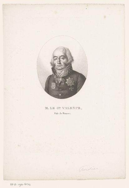 Charles Aimé Forestier created this portrait of Jean-Baptiste Cyrus de Timbrune de Thiembronne, graaf van Valence, using a printmaking technique. The image is defined by delicate lines etched onto the plate's surface, where ink was then applied to capture the Count of Valence's likeness. Look closely at the uniform. Notice the intricate details of the embroidery and decorations. The precision here speaks to the engraver's skill but also to the era's social values. Printmaking allowed for the wider circulation of images, playing a crucial role in shaping public perception and solidifying social hierarchies. This portrait reflects the labor involved not only in the artistry of engraving but also in the representation of power and status during the late 18th and early 19th centuries. Understanding its material and context invites us to think about the boundaries between art, craft, and the broader currents of social and political life.