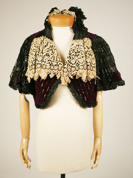 Curator: Standing before us is a captivating cape, likely crafted between 1893 and 1899. It hails from the House of Worth and is currently housed at the Metropolitan Museum of Art. Editor: My first impression? An intriguing study in contrasts—a somber color palette brought to life by vivacious texture. The ruffles and cascading elements almost give it a life of its own. Curator: Precisely! House of Worth was at the pinnacle of haute couture at the time; the cape demonstrates the way clothing in this period became infused with political meaning through displays of luxury and class distinction. Only wealthy women could acquire and wear such clothing. Editor: Speaking of that wealth, let’s consider the formal arrangement. The composition's complex, the eye struggles to find rest. There's a cascade of frills that lead you down the form but the black almost swallows up all the detail unless you step up close to see each layer, ruffle, and bit of embellishment. Curator: That dramatic effect would have resonated within specific societal expectations. A Worth design served as an emblem, projecting both refined taste and, more crucially, social eminence. In that period of nascent modernity, apparel frequently functioned as a critical indication of belonging. Editor: And what do you make of the color, or lack thereof? While many garments from this era use colors that project warmth and regality, it almost evokes absence. Curator: Mourning became extremely fashionable, so its ubiquity was indicative of that period. Wearing such garments allowed aristocratic women to openly grieve losses, so in effect the color did offer them protection under the veil of social custom. Editor: It's fascinating how a color can be both an expression and a restraint! In looking more closely at the textures now, I am struck by the interplay between opacity and transparency and the effect they must create in motion. It is almost cinematic! Curator: I think this garment encapsulates an era undergoing social changes but with very clear social guidelines dictating access and acceptance, from the labor that created these kinds of embellishments to the status that a name like "Worth" conveyed. Editor: Yes, examining how design functions to relay and solidify status has revealed an entire other story behind its beauty, so that when we think of this piece it will be impossible to see just the fabric and color ever again.