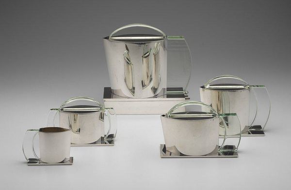Curator: Here we have a silver sugar bowl, likely dating to the 1930s, and on display at the Minneapolis Institute of Art. It’s quite striking in its simplicity. Editor: Austere is the first word that comes to mind. The hard, reflective silver surfaces against the off-white, rectangular ivory knob create a sharp contrast, wouldn't you say? The pure geometric form is almost severe. Curator: I'm inclined to agree. These sorts of refined tablewares arose, as we well know, from a context steeped in changing social norms. With afternoon tea rising in popularity, it reflected the emergent rituals surrounding it. The elite's pursuit of elevated tastes led to the desire to produce artworks such as these. Editor: Exactly. And structurally speaking, notice how the rectangular forms repeat throughout each component: the body, the lid, even the ivory knob. The minimal embellishments only heighten this sense of purified geometry, though softened somewhat by rounded edges. Curator: I find it fascinating how designers of the period grappled with these mass-produced objects, attempting to elevate them through material and form, as seen in this instance through the use of ivory on the silver bodies. This approach echoes similar sentiments among certain architecture circles from the interwar years. Editor: Absolutely. These shapes certainly resonate with a modernist ethos, an embrace of the industrial age aesthetic, however softened for the bourgeois home. And it encourages a shift in perspective toward the art. Is its existence purely pragmatic or, given its carefully rendered form, does it also take on sculptural qualities? Curator: An interesting paradox. Such silverware embodied a desire to reconcile the machine-made with a longing for handmade elegance. So the form follows function, but with artistic intent, one could say. What initially seems stark quickly becomes quite rich with the understanding of the object's environment, as well as careful examination. Editor: I think this "Sugar bowl," reveals quite a bit about a historical push-and-pull between mechanization and artistry, while also inviting us to consider, above all, its underlying composition, structure, and geometric elegance. Curator: Indeed. And a good point, ultimately highlighting art’s connection to the societal forces. Thank you.