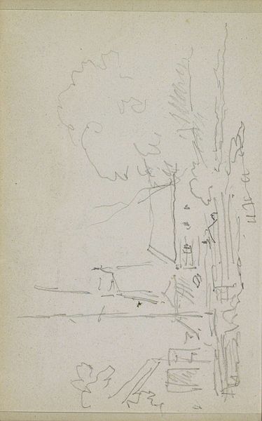 Adrianus Eversen made this sketch, Dorpsgezicht met een kerk, using graphite on paper. Eversen lived and worked in the Netherlands during the 19th century, a time of significant social and political change, including the rise of industrialization and urbanization. This sketch offers a glimpse into the artist's preliminary exploration of a village scene. Eversen's identity as a landscape painter is clear, even in this early stage of artistic development. The church, a central feature, acts as a focal point amidst the surrounding architecture and natural elements. While this sketch may lack the detail of a finished painting, it invites viewers to consider the artist's process and the choices he made in depicting the scene. It provides a lens through which to examine the social and cultural values embedded in landscape painting during Eversen's time. The sketch allows us to consider the relationship between the artist, the subject, and the broader cultural landscape of 19th-century Netherlands.