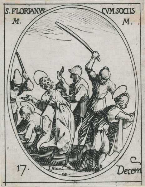 Curator: This is Jacques Callot’s "Saints Fusca and Maura," an etching from the early 17th century. It's quite small, only about 7 by 5 centimeters. Editor: The stark contrast of the lines gives the scene a really grim feel, doesn't it? The composition is undeniably dramatic. Curator: Yes, Callot uses the circular frame to intensify the martyrdom’s stage. The central figures, Fusca and Maura, stand stoically, while the executioners are actively torturing them. Editor: Considering the historical context, these prints likely played a role in shaping religious and political identities. The imagery of martyrdom served as a powerful tool. Curator: Precisely. Callot masterfully employs line and form to convey the emotional gravity of the scene, transcending the constraints of its diminutive scale. Editor: It’s incredible how such a small image holds so much narrative and emotion, even centuries later. Curator: Indeed, it's a poignant reminder of the power of art to transcend time.