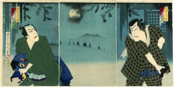 Curator: This is Kobayashi Kiyochika's woodblock print titled "Braving the Bitter Cold, Our Troops Set Up Camp at Yingkou," now residing at the Harvard Art Museums. Editor: Immediately, it feels like a scene shrouded in a sort of stoic sadness. The figures, almost silhouettes, huddle around this vibrant, but lonely fire. Curator: Kiyochika created these prints during the First Sino-Japanese War, and they were circulated widely, shaping public perception of the conflict and national identity. Editor: The artist renders the snow with such delicate detail. It gives me a visceral sense of the biting cold, despite the fire blazing right in the center. It is a scene of war, yes, but also an almost melancholic tableau of endurance. Curator: Indeed. These prints played a crucial role in fostering a sense of shared experience and sacrifice during wartime. Editor: It certainly makes you reflect on the human cost, beyond the grand narratives of war. A poignant image, really.