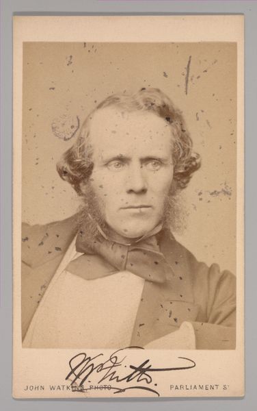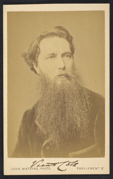 Curator: Let's take a moment to consider this photograph, “[Thomas Faed],” attributed to John and Charles Watkins. It’s a gelatin-silver print and albumen print from the 1860s, housed here at the Metropolitan Museum of Art. What's your initial reaction? Editor: Sepia dreams, Curator! The image exudes a feeling of pensiveness, maybe even a bit of melancholy. That soft, hazy light swirling around his hair and beard, framing a face that could launch a thousand thoughts. Curator: Absolutely. The photographic portrait gained prominence during this period, democratizing access to representation, even as the photographic process reflected specific class and gender dynamics. Thomas Faed was a successful painter and the image's Romantic style reflects the sensibilities of his art. Editor: Right! There's this deliberate air about it. His cloak casually draped. I mean, do you think he spent ages crafting this "natural" pose, a look meant to capture his artistic soul? It’s like performance, a deliberate construction. Curator: Precisely. Portraits such as this one provided a vital conduit for reinforcing prevailing societal values. Here we see the valorization of the intellectual, the man of artistic standing and cultural capital. The very act of commissioning such a portrait denotes a claim to power and visibility. Editor: So true, and what about those dreamy eyes looking slightly off center? It's as though he's trying to gaze straight into your soul. It's both alluring and distancing—quite clever for a portrait meant to inspire awe! I suppose, given the limitations of the period, such portraits had to be extremely staged and composed? Curator: Indeed. The subject needed to be relatively still for the exposure time, yet photographers used a range of strategies to capture individuality. His gaze deviates from direct address, allowing for contemplation. This, in its time, may have communicated his particular artistic sensibility to potential audiences and patrons. Editor: Looking at it now, I am considering the legacy of images, the constant dance between intentionality and interpretation. Every photo becomes a mirror reflecting not just the subject, but also us. It reminds me we, the viewers, are inevitably a part of the picture, coloring it with our own present experiences. Curator: I agree. We imbue the work with meanings resonating within current conversations around gender, identity and power. Editor: Well said. So, much for such a seemingly simple picture to communicate still. Curator: It's what renders it endlessly interesting.