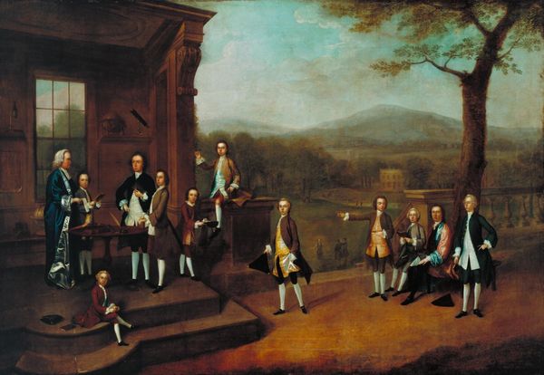 Curator: Standing before us is John Quidor’s "Rip Van Winkle," an oil painting created in 1829. The painting resides here at the Art Institute of Chicago. Editor: It strikes me as chaotic, but in a folksy, almost humorous way. All these people, with so many confused and surprised faces. There's something off-kilter but compelling in how the artist stages this moment of realization or perhaps even alienation. Curator: The painting illustrates Washington Irving's popular short story. Note how Quidor renders the narrative. The focus is on the altered state Rip is experiencing, reflecting the rapid political and social shifts occurring in the US. See the background compared to the colonial foreground—there are visual juxtapositions that underline Rip's bewildered sense of displacement. Editor: So, he's not just some sleepy guy, he’s become a symbol for the upheaval of tradition by, say, burgeoning democratic ideals? The very symbols around him are no longer the same and thus have no weight anymore? That kind of feeling… I think that resonates. Curator: Absolutely! Consider how Rip himself, and the men playing nine-pins in the background, draw on familiar iconography of folkloric characters, perhaps gnomes or wood spirits. Even his clothing implies an allegiance to an older order clashing against the newer fashions emerging post-revolution—there is tension embedded within Rip as a character. The cultural memory is palpable. Editor: That explains the initial sense of disarray. These disparate symbols and cultural fragments are wrestling within the same space. Quidor almost invites us to feel Rip’s vertigo in the face of historical transformation, presenting a before and after version of the nation itself. So much is told through spatial organization. Curator: Precisely. And even the somewhat flattened perspective enhances this stage-like quality, reminding us of art's role in constructing historical narratives, where some people are inevitably displaced or written out of the story altogether. Editor: Yes, looking again, the composition highlights exactly how individuals and their experiences are buffeted by socio-political winds, and that such transformation is not as simple as waking up from a nap. Curator: Indeed. Quidor presents us with not just a literary illustration, but a complex cultural and political commentary woven into a deceptively simple image. Editor: Well, now I'll carry that with me!