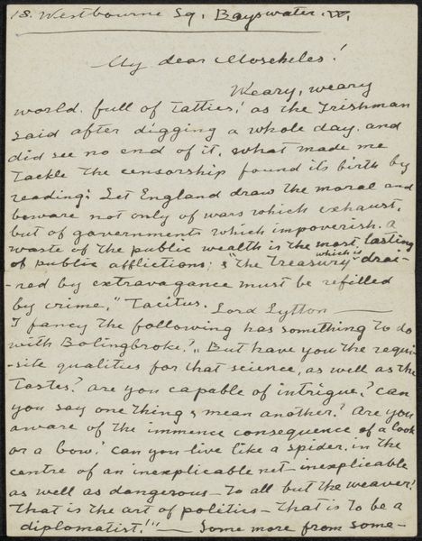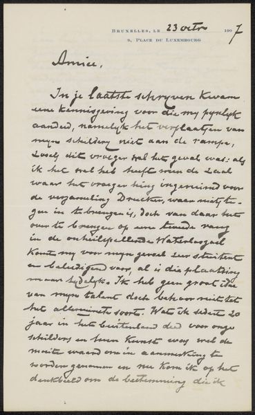 This is Paul Joseph Constantin Gabriël’s letter, "Brief aan Pieter Haverkorn van Rijsewijk." The visual experience of this document is dominated by dense, dark script against a lighter background, creating a stark contrast. The handwritten text, with its loops and varying line weights, gives the work a sense of immediacy. The letter's form, with its structured lines and marginal notes, offers a glimpse into the formal conventions of correspondence during Gabriël's time. This letter can be viewed through a structuralist lens. Each word acts as a signifier within the broader linguistic structure, conveying not just the explicit content of the message but also implicit meanings. The act of writing itself, with its inherent formality and personal touch, engages with broader cultural codes around communication. The letter challenges fixed notions of artistic expression, suggesting that even mundane communication can be imbued with artistic intent. The materiality of the letter—paper and ink—adds another layer, grounding the artwork in its historical context. This letter serves not just as a personal message, but as a cultural artifact that invites ongoing interpretation.