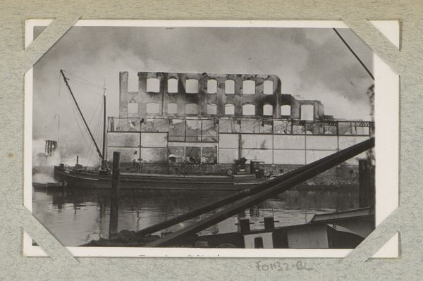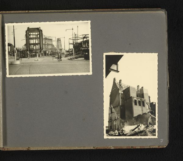 Curator: This is a photograph entitled "Ruïnes te Rotterdam" by J. Nolte, likely taken between 1940 and 1945. It’s a gelatin-silver print. Editor: The devastation is palpable, isn't it? Even through the starkness of the black and white, you feel the weight of what's been lost. The city seems almost skeletal. Curator: Yes, Nolte captures that atmosphere masterfully. Notice the composition; the destroyed buildings loom in the background, contrasting with the relatively intact street in the foreground. It creates a visual hierarchy. Editor: It also emphasizes the human element, doesn’t it? Seeing those few figures walking amidst the debris makes you think about the labor required to rebuild, the physical work of clearing the wreckage, and also the work to get back to normalcy. Curator: Precisely. The geometry of destruction plays against the implied lines of the city's planned structure. Note the textures, the way the light catches the broken brick. Editor: Those materials though—bricks, steel—transformed into rubble. I think of the factories, the workers who forged those elements, and now their labor has resulted in a city in ruin. It's quite jarring to consider. Curator: Indeed. The stark contrast reinforces the abrupt end to production and life during that time. You could read it as a potent symbol of broken Modernist ideals too. Editor: And yet, those individuals walking through the landscape of broken production become active participants, redefining it in a materialist way by their resilience to live beyond those ruins. It gives one hope. Curator: A thought-provoking intersection of aesthetics and social reality. Thank you for this consideration of Nolte's image. Editor: My pleasure, finding those small human efforts in it leaves a bigger impression in the end.