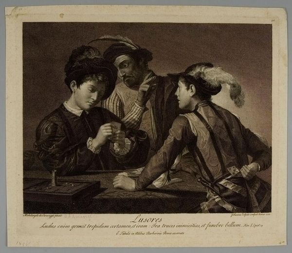 Editor: This is "A Game of Backgammon" by Jacques Firmin Beauvarlet, an engraving. The scene feels intimate, almost secretive. What can you tell me about the materials and production of this print? Curator: Consider the copperplate engraving process. The labor, the tools, the consumption of materials like ink and paper. This wasn't merely reproducing an image; it was crafting a commodity for a specific social class. What does the inscription suggest about the context of its creation and circulation? Editor: It was made to be sold from the Cabinet de M'le de Vince.. So, it was meant for the upper class. I hadn't thought about the print itself being a commodity. Curator: Precisely! The print is less about the ‘game’ and more about access, consumption, and the system of artistic production during that period. How does that understanding shift your perception? Editor: It does make me reconsider the art and craft involved.