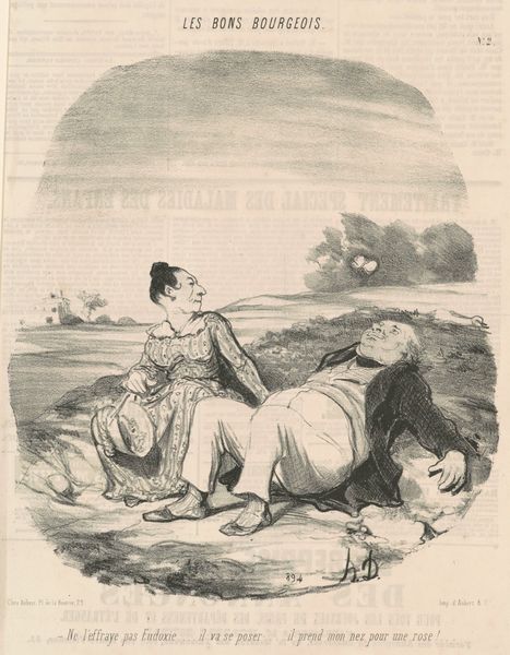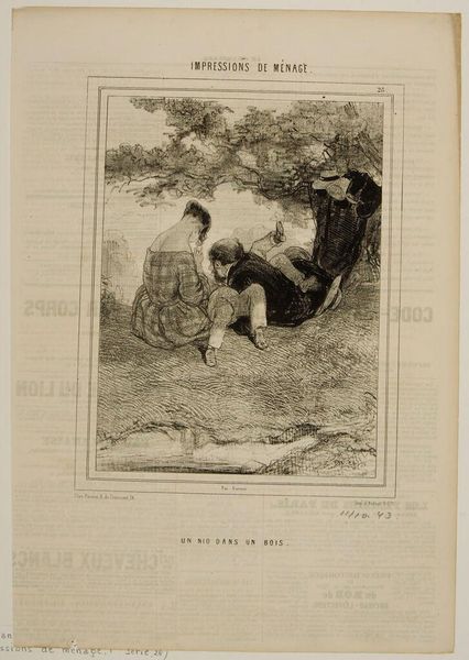 Curator: Honoré Daumier's lithograph, dating from the 19th century, titled "Danger de secouer trop fortement... Un prunier," presents an immediately striking image. What's your initial take? Editor: It has a chaotic yet comical energy. The distorted figures and frantic lines create a sense of instability and imbalance. Curator: Absolutely. The image features a well-dressed man hanging precariously from a tree branch, seemingly shaking it violently while a woman cowers beneath, possibly frightened. Considering the context of Daumier’s work as social commentary, this scene can be interpreted as a critique of bourgeois excess and its consequences, especially how their actions impact those around them. Editor: Yes, I see how the social commentary lens provides a strong understanding, but the man hanging on a plum tree – the dramatic use of chiaroscuro – directs the viewer's eye along lines of extreme, opposing diagonals; and this formal quality further amplifies the narrative and also our subjective response to what is, effectively, an absurdist situation. Curator: Daumier frequently used caricature to satirize the behaviors of the elite, revealing the potential harm caused by their self-absorbed actions, in intersection with class structures, wouldn’t you agree? The falling fruit or leaves might even symbolize lost opportunities or the disruption they cause. The lithographic medium lends itself well to such depictions through bold lines and stark contrasts. Editor: Agreed. Though his intentions of his political-satire might be Daumier’s overt aim, and indeed lithography as the industrial technique of mass distribution has socio-historical and political implications of its own – yet the immediate optical impression of the stark composition of these bent figures, as if arranged as the diagonals of a ‘broken’ X, is rather more emotive. And look at the way the shadows are sketched rather rapidly! I can feel his pen strokes here... Curator: Exactly. That interplay, however, reveals the complexities of the artist’s social viewpoint while making commentaries on the established. Editor: Well said. This viewing’s enabled me to feel afresh the emotive charge underlying Daumier's composition. Curator: It certainly deepened my sense of the historical factors informing it.