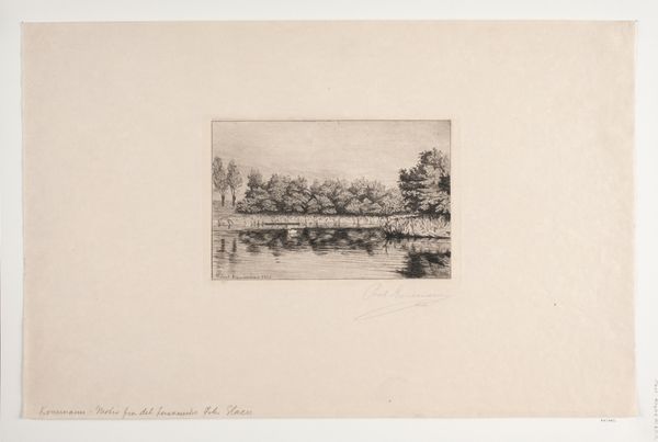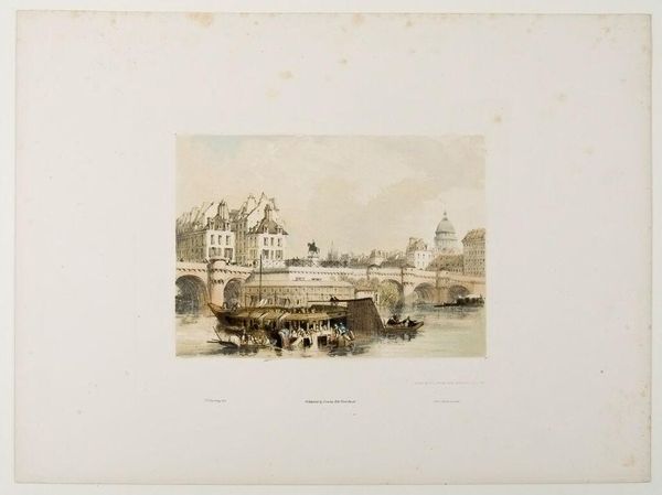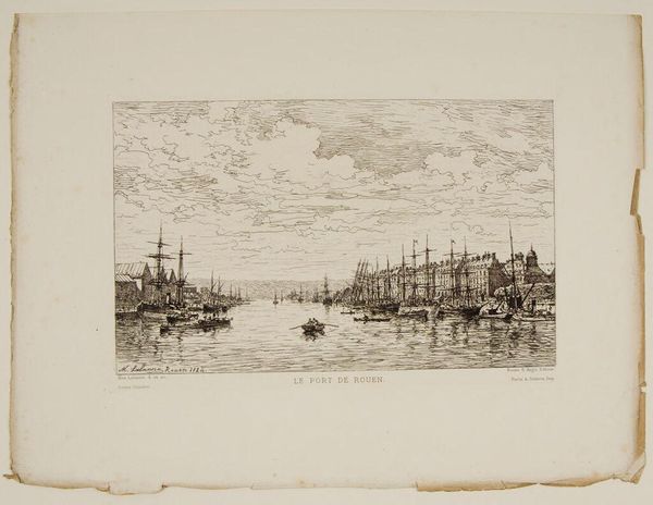 Curator: This is Alfred Louis Brunet-Debaines' "View of the S. Louis Bridge." The etching, held in the Harvard Art Museums, presents a moment of 19th-century Parisian life. Editor: It has such a quiet, melancholic feel, doesn't it? The bridge stretches across the Seine, and those little boats seem almost frozen in time. Curator: Brunet-Debaines was known for his precise technique and meticulous attention to detail. Look at how he captures the textures of the buildings and the reflections in the water through the etching process. The socio-economic implications of riverside labor also add to the piece’s profundity. Editor: Absolutely, and the subtle gradations create a lovely atmospheric perspective. It feels like a memory, fading gently at the edges. Curator: The etching technique allowed for the mass production of images, making art more accessible, yet also changing its status as a commodity. Editor: I see the city breathing, you know? I get lost in that bridge, imagine wandering through those streets. It reminds me that even in the busiest cities, there are quiet corners. Curator: Indeed, it’s a moment captured in time. Editor: I love how the print speaks volumes, despite its simplicity.