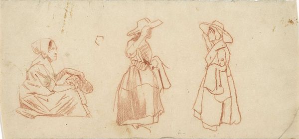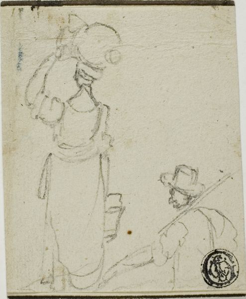 Editor: So this drawing, "Three Figures" by Samuel van Hoogstraten from around 1660, done in pencil on paper, strikes me as so intimate, like a quick glimpse into someone’s daily life. It feels very unposed and informal. What's your interpretation? Curator: It’s interesting you use the word 'intimate'. These figure studies offer us a window into 17th-century Dutch society, and art’s role in it. Hoogstraten wasn't just recording what he saw, but potentially also exploring social roles. Notice how only one figure makes direct eye contact, that would’ve certainly influenced how contemporary audiences would view the social dynamic between the three figures represented. It could easily suggest the figure looking away lacks social dominance. Have you considered how portraiture reinforced the hierarchy in Dutch society? Editor: That’s fascinating! I was just focusing on the sketch-like quality. I hadn’t considered how Hoogstraten might be playing with ideas of social class through the composition and how figures engage. So, beyond being preparatory, are you suggesting that art during this time inherently served a function of reinforcing societal structures? Curator: Well, art rarely exists in a vacuum. Patronage played a huge role, naturally. The merchant class was gaining influence and creating demand. Also, think about how visual representation legitimized power during this period. It becomes more about what portraiture *does* rather than merely *is*. The social meaning outweighs simply replicating reality. Do you agree? Editor: It gives me a lot to think about, this art both reflected *and* actively shaped Dutch social hierarchies, even in what seems like a quick sketch. I'd never considered how much these representations were influencing a larger population, like with magazine editorials or Instagram today. Curator: Exactly. Art wasn't just hanging on walls; it was doing cultural work. Hopefully it adds new perspective as you continue learning about the period.