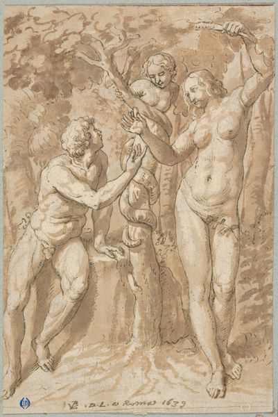 Curator: This drawing, currently residing at the Art Institute of Chicago, is titled *Crowning of Hercules*. It is an ink, chalk, charcoal, and pen drawing by Paolo De Matteis, although the precise date of its creation remains unknown. Editor: It's immediately striking—almost like a dream sequence. The sepia tones lend a sense of antiquity, and the figures seem to float within the space. The bold figure on the left immediately pulls the viewer in, slumped and yet powerful in stature. Curator: Indeed, De Matteis masterfully employs Baroque drama in this depiction. Hercules is portrayed, but in a moment of relative repose rather than active labor, as is typically shown in depictions of him. Editor: Right, which speaks to the cyclical nature of stories! Hercules is a figure that contains the strength, violence, triumph, and the *memory* of the Classical world within him. This drawing taps into those archetypes and then adds the weight of exhaustion and pensiveness. The victor reflects, as he should. Curator: Precisely. This choice of depiction challenges the classical ideals of heroism popular during the Renaissance and Early Baroque periods. By displaying a Hercules vulnerable, perhaps tired of constant displays of power, De Matteis is engaging with deeper aspects of this hero's narrative—even revealing inner psychological terrain that the stories sometimes gloss over in favor of a relentless external journey. We also must remember that crowning ceremonies are political acts as much as they are devotional; what are the political ramifications of crowning Hercules? Editor: That adds a completely fresh layer. It moves it from a moment of quiet, internal reflection to a politically charged one. It makes you wonder who these characters around him are. Do they see this man worthy of political rule or of something more godly and beyond their scope of power? The man presenting the crown seems benevolent but who does he represent? And the figure above who is projecting a loud noise... Who are they announcing the crown to? It certainly leaves me with a lot of unanswered questions. Curator: Which might very well be the intention of the artist: to trigger contemplation more than provide answers, echoing in viewers the introspective mode Hercules himself inhabits here. Editor: A vulnerable, yet heroic and iconic figure that perhaps, unknowingly to us, challenges contemporary societal views of leadership. It certainly has that emotional weight, to this day. Thank you for your insights.