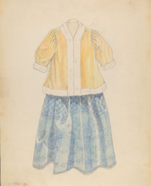 Curator: Editor: This drawing, "Jacket," from around 1937, simply rendered with pencil, features two sketches of what looks like a rather vibrant jacket. It's a burst of colour against the paper. What strikes me is the attention to detail in the plaid pattern. How do you interpret this work, particularly its creation in the late 1930s? Curator: The focus on the garment itself invites us to consider its production. We might investigate where the cloth was sourced, who wove it, who designed and manufactured the jacket itself, and finally, who would have consumed this garment. The use of plaid could also suggest links to specific textile traditions and their cultural significance. Is it imitating hand-woven cloth? Editor: So, it's not just about the aesthetic but about the whole process behind making something like this. It's almost like the drawing serves as a document of labour and consumption. But would such considerations truly be important to the artist? Curator: Perhaps. Consider the rise of industrial manufacturing during that period and its impact on craftsmanship. Maybe this sketch implicitly asks: What is lost when fashion becomes industrialized? How do mass-produced items change our relationship to clothing? It begs the questions: who had access to garments like these? How available was raw cloth and sewing machinery, if it was even constructed using machines? Editor: That is interesting. Viewing it now, the work moves beyond just being a fashion sketch; it speaks about broader socio-economic realities connected to the textile industry at the time. Thank you. Curator: Exactly. Focusing on the material aspects and social contexts allows us to unpack layers of meaning beyond mere surface appearance. Hopefully you see it now in that way, too.