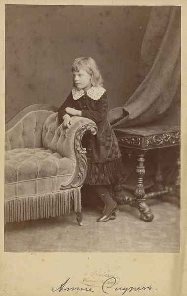 Curator: This is a silver print daguerreotype made in England in 1864, a portrait of Margaret Frances Langton Clarke by Lewis Carroll. Editor: What strikes me immediately is the fragility. The sepia tone, the way the light catches the silver – it feels almost like holding a memory. You can almost feel the cool, smooth texture of the plate beneath the emulsion. Curator: Absolutely. Daguerreotypes were quite unique in their time. They offered a level of detail previously unseen. The process itself, involving polishing a silver-plated copper sheet and using mercury fumes, speaks to a very different relationship to materials and labor. Editor: It's laborious, isn't it? The focus required, the cost... This wasn't casual photography. And look at the details: her clothes, her boots. The care and time somebody put into creating not just the image, but these garments themselves. A portrait is often also an opportunity for showing status. Curator: Precisely. The fact that the Clarke family commissioned Lewis Carroll to create this work suggests a certain level of social standing and an understanding of the cultural currency of photographic portraiture. Such photos offered new ways of seeing and being seen, contributing to social narratives about identity and respectability. Editor: And the doll… It is a manufactured object that mimics life, presented to this little girl to make her aware of her position in society: woman, mother. What does it say about how we commodify childhood and mold gender? Curator: It’s a starkly beautiful reminder of how image-making is deeply enmeshed within social and industrial forces. It reflects ideas of childhood, family, class, and gender at a particular moment in Victorian England. The photo has a long exposure, it took the young sitter long minutes to stay still to fix her pose, adding to that an almost ghostly air about her. Editor: The amount of craft to build those backdrops, those clothes, those toys to tell people how to behave is insane! It is like all of this stuff, carefully positioned and placed into the photograph, gives Margaret more weight than she is really old, it enhances the image, it increases its presence. I do admire that process of capturing, how that has been able to capture one face on this metal and it gives the spectator the access to know more. Curator: And looking at this daguerreotype again, you notice something new with each viewing. Editor: A single silver plate revealing so much—about its subject, its maker, and the time it was made in. Fascinating!