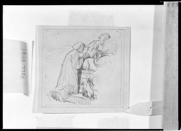 Editor: This is Moritz von Schwind’s "Noli Me Tangere, after Dürer." It's a small print at the Harvard Art Museums, illustrating a biblical scene. The woman's posture seems so vulnerable. What draws your eye in this piece? Curator: The title itself, "Noli Me Tangere," or "Touch Me Not," speaks volumes about boundaries, especially regarding power and the female body. Consider the historical context: religious narratives often portrayed women as subservient. How does Schwind's interpretation challenge or reinforce those ideas? Editor: I hadn’t thought about the power dynamics. It's like she is reaching for something unattainable. Curator: Exactly. And Dürer's influence suggests a dialogue with the Reformation's emphasis on individual faith. This work prompts us to examine how religious stories are used to negotiate social and political change, especially concerning women. What can we learn from the woman’s representation? Editor: Viewing it through that lens makes me reconsider the whole scene as something much more complex. Curator: Indeed. Art is rarely neutral. Examining its context reveals its potential for resistance or complicity.