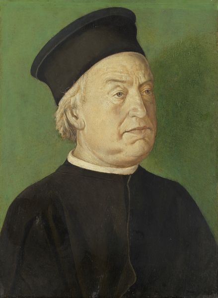 Curator: Standing before us is Hugo van der Goes’s “A Benedictine Monk,” likely completed between 1480 and 1483. The work is rendered in oil paint. Editor: Instantly, there’s such a contemplative sadness in his downturned gaze. He seems weighted, not by the earth, but by something intangible, something felt. Curator: The painting exemplifies the Early Renaissance style with its move toward realism, especially in rendering the human form, with light and shadow playing to model three-dimensionality, while hearkening back to a monochromatic presentation style, using oil for saturation rather than varied hue. Consider how this realism would have played against expectations and production standards of its era, what kinds of labor supported the realization of his image? Editor: Oh, totally. He isn't idealized—you can see the wrinkles, the weariness. But this makes him approachable in a strange way. I find myself wondering about the actual monk: Was he this serious? Did van der Goes exaggerate this melancholy, imbue the figure with a sense of pathos perhaps representative of broader societal tensions of the time? Curator: Exactly! Early Renaissance painters often walked this tightrope. And it's crucial to remember how the social conditions dictated what could be painted and how. Someone commissioned this, likely with very specific ideas about its function and reception. Van der Goes may have innovated with his technique and representational skills, but that experimentation happened within certain constraints, always impacted by those patrons and the institutions that gave meaning to works. The artist both pushed against those restrictions and needed their labor to succeed. Editor: I can imagine him now. Did the Monk's stoicism betray some world-weariness that the painter could immediately discern in the human figure. His skill brought their stories together for the eye to see across so much time. I love how portraits like this feel like tiny time machines! Curator: They certainly offer us insight into the social, economic, and religious values attached to representing people, but often, a patron with disposable wealth wanted a monument made in their honor. These paintings had specific intended audiences, from other elite citizens to, maybe, future generations of religious dependents. Editor: In looking into the future by reflecting upon an intimate present. Food for thought indeed. Curator: Agreed. Every painting is like a set of contracts negotiating aesthetics and cultural power, which ultimately determine how such a work lands here, now, for our considerations.