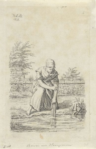 Frederick Bloemaert created this etching, "Vrouw met een slang," whose date is unknown, using a technique of fine lines to depict a woman confronting a snake. The stark contrast between the pale figure and the darker, subtly shaded background creates a dramatic tension, focusing our attention on the interplay between the characters. The composition, a study in contrasts, pits the verticality of the woman and her staff against the coiled, horizontal threat of the serpent. The woman's form, draped in heavy fabric, suggests a solid, almost architectural presence, while the snake introduces a dynamic, destabilizing element. This contrast extends to the symbolic level, where we might read the woman as a symbol of reason or order, challenging the chaos and temptation represented by the snake. However, the lack of clear resolution leaves room to interpret, inviting us to consider the power dynamics and moral ambiguities inherent in such encounters. The formal elements thus invite a deeper exploration of cultural narratives around gender, power, and morality.