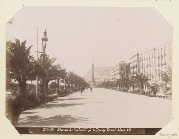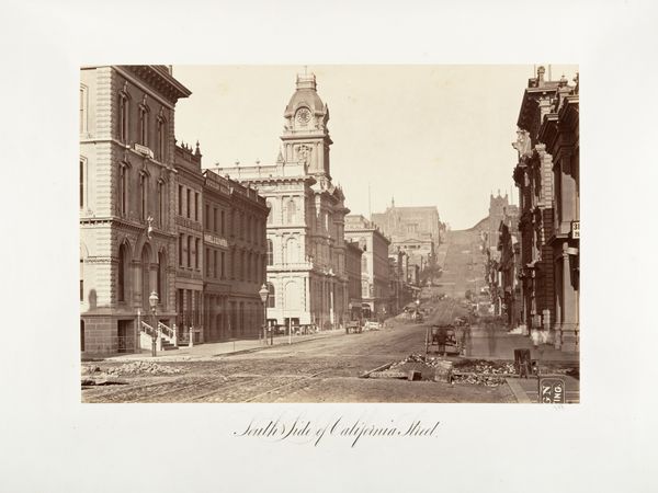 Editor: This is "Gezicht op Main Street te Port Elizabeth," taken sometime between 1880 and 1894 by Robert Harris. It’s a photograph, and it's fascinating seeing a street scene frozen in time like this. How do you approach a work like this, given its historical context and medium? Curator: I’m drawn to the material reality of early photography. Think about the cumbersome equipment, the long exposure times, the limitations of the process. It shaped what could be depicted. The people are mostly blurred, a trace of activity, whereas the architecture, evidence of labor, stands rigid. Editor: So, you're focusing on the photographic process itself and how it influenced the image we see? Curator: Precisely. And consider Port Elizabeth at the time. This image documents the constructed environment and all the material interests, such as signs like ‘Tipper's Furnishing Warehouse’, that comprised the burgeoning South African urban center at that moment. The wide street suggests colonial planning and resource transport. Does that register with you? Editor: It does, now that you point it out. I was mostly seeing a quaint scene, but there's more to it than that. Curator: What happens when you consider this image as a record of resource distribution at the time it was taken and also an example of colonial consumption by people living on stolen land? The technology of photography has created a new way to document social and economic inequity in the built environment, doesn't it? Editor: I’ve definitely learned to look beyond the surface and think more critically about the materials, labor, and underlying social forces at play in what I’m viewing. It makes it much more impactful!