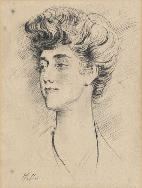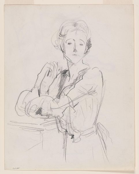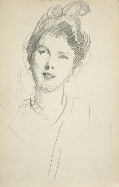 Editor: This is a sketch by John Singer Sargent titled "Mrs. Joseph Chamberlain." It's a small drawing, just pencil on paper. The quick, almost frantic lines give it an unfinished feel. What stands out to you? Curator: The immediacy and visible labor are compelling. Sargent’s swift marks reveal the process – the material engagement of pencil to paper. This challenges notions of artistic genius, revealing the skilled work behind the image. How does this labor relate to Chamberlain's social standing? Editor: Interesting. I guess I hadn't considered how the act of sketching itself reflects the power dynamics. I see your point now. Thanks! Curator: Indeed, by examining the means of production, we can see how wealth and access influenced artistic creation.