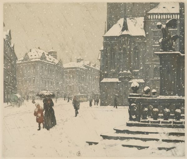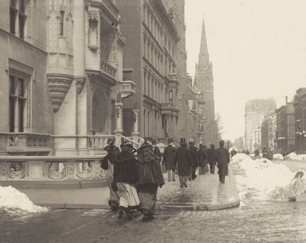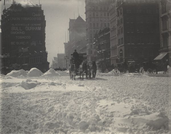 Editor: We're looking at Alfred Stieglitz's "Winter on Fifth Avenue," a gelatin silver print made sometime between 1893 and 1932. It's strikingly bleak; the whole scene is enveloped in swirling snow. It looks…miserable. What strikes you most about this piece? Curator: "Miserable" is one way to put it, but I see a gritty sort of beauty in it, you know? It's about finding elegance in the everyday struggle. Look at those horse-drawn carriages, battling through the snow. There’s a raw, unvarnished quality to this city life. For Stieglitz, this image, rendered in tones of pure grey, represents both a visual poem, and a stark reality of early 20th century life. Do you think Stieglitz romanticizes this scene, or captures it truthfully? Editor: That's an interesting question... maybe a little of both? The soft focus does lend it a certain dreamlike quality, but those determined horses really pull me back down to earth. Curator: Exactly. He elevates the mundane through artful composition and lighting. It's a beautiful paradox. This scene becomes, simultaneously, universal and deeply personal. What feeling do the stark, barren trees evoke, as they disappear in the haze of snow? Editor: Melancholy. It’s like even nature itself is bowing to the harshness of the city. So, it’s not just about the photo being of New York, but almost like a psychological landscape. Curator: Absolutely. Stieglitz used photography as a mirror to the soul, reflecting not just what he saw, but how he felt. He turns one ordinary city block into the theater of our innermost dreams and fears, and everything in-between. Editor: It’s funny, I came in thinking it was simply a depressing photo, but now, it's complex and reflective. Curator: See, art sneaks up on you when you least expect it. Like a good blizzard!