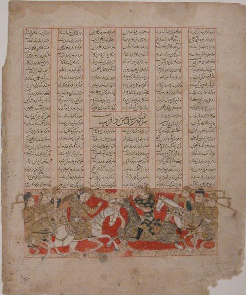 Editor: Here we have "Page of Calligraphy from a Shahnama (Book of Kings)," created sometime between 1585 and 1635. It's ink, colored pencil, and paper. The detail in the script is striking, although I can't read a word of it! What draws your eye to this particular page? Curator: My attention is drawn to the overall balance. Note the confident framing; the outer border is not quite even but it still lends definition. See how the internal divisions of the text are balanced with their relation to the page? There's a careful calibration between script and void. The columns of text operate almost as architectural supports. Do you see that tension? Editor: I think so... It's like a building, each column is sturdy and holds up the page. I see the whole thing feels contained. But if it's supposed to be like architecture, shouldn't it be precise and neat? It’s clearly quite worn. Curator: The slight asymmetry only heightens the visual experience. The page is a testament to surviving through time. The damage to the outer border reminds us of its materiality, its physical existence. If it were pristine, would it have the same impact? Editor: I see what you mean. The imperfections make it feel real. The design still works, even after all this time and damage! I focused on the script at first, but the framing really makes it feel complete. Curator: Exactly. Form and function united through careful balance. What started as simply script became art.