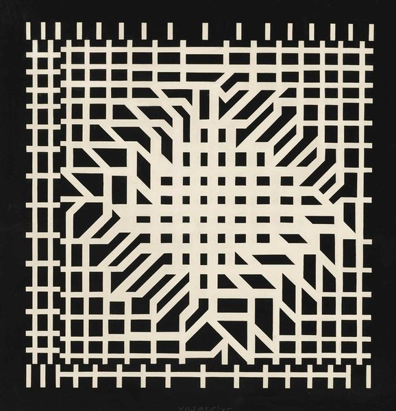 Curator: What first strikes you about Victor Vasarely’s ‘Grille,’ a drawing from around 1952? It's such a precise and seemingly simple work of Op Art. Editor: Well, immediately the grid overlaying this organic shape, makes it quite dynamic, though executed using very rigid lines. It almost feels like something organic is trying to break free from a system. What is your interpretation of this work? Curator: My eye goes to the way Vasarely co-opts industrial methods. Look at how the grid, usually a system of organization and control in industrial design, becomes a means of distorting perception. Think about the materials available and their impact on this work. Was the intent about making art accessible via new techniques or more mass-produced methods? What was the artist able to express using the available materials? Editor: I never considered it that way. I guess the process of creation really informed how we receive the artwork. And the materials… I assume they would affect its status as ‘art’. Is the piece made with expensive materials, or those that anyone might easily access? Curator: Exactly! It is drawing that uses ink, it would've been considered less "art" and more like mass culture during its historical moment. And those industrial or mass-producible roots were radical! He takes tools from the world of labor, tools anyone could use, to make us question what art is. What assumptions is the artist challenging? Editor: The social impact of such creation method, challenging the boundary between ‘art’ and more mundane ways of making things. The meaning really shifts once you start to examine the materials used and processes of making… Fascinating! Curator: Precisely! By exploring the materials, tools and the means of production, we can start to break down old notions.