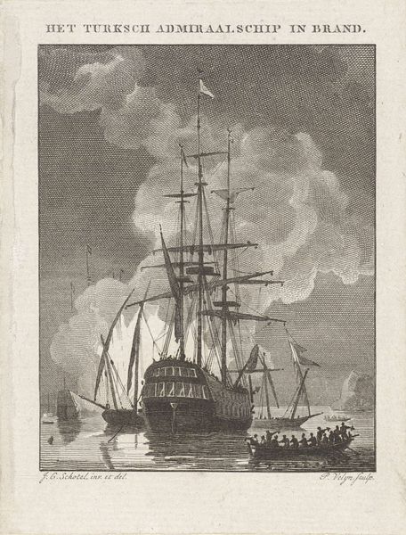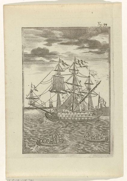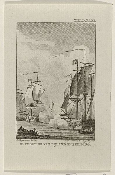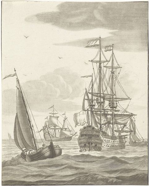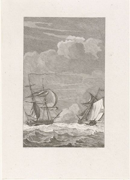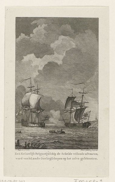 Reinier Vinkeles created this print, "Tegenhouden van de keizerlijke brik op de Schelde," in 1784. The composition, rendered in monochromatic tones, balances the dynamism of naval action with a serene sky. Shapes of billowing sails and cumulus clouds create a dialogue between natural and man-made forms. The texture of the water, achieved through delicate hatching, contrasts with the solid geometry of the ships. This interplay of textures and forms evokes a sense of controlled energy typical of 18th-century Dutch maritime art. The artwork presents a system of signs, where ships symbolize power and trade, and clouds may represent the unpredictable forces of nature and the disruptions of war. Vinkeles doesn't merely depict a naval scene but engages with broader cultural ideas about maritime strength and its inherent risks. The print invites us to consider how formal elements combine to create a narrative.