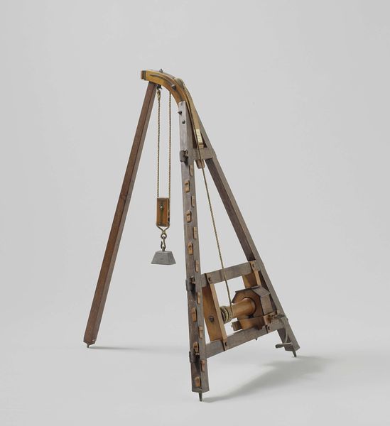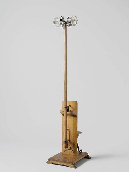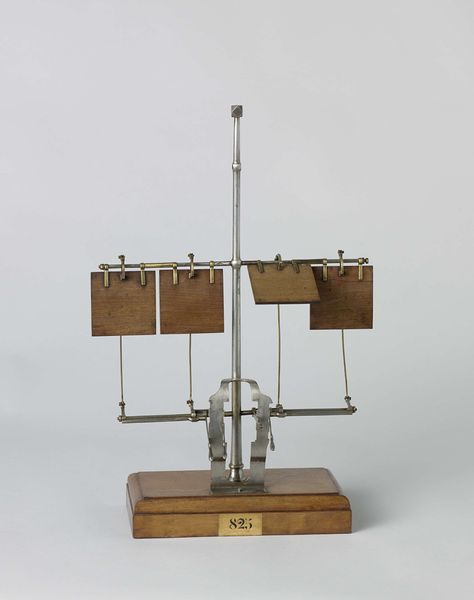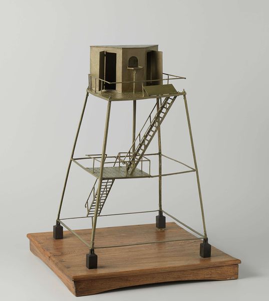 Editor: This is a "Model of a Land Beacon," dating from around 1850 to 1855. It's an intricate object, and the material looks like iron or steel. There's a stark quality to it, yet the construction seems almost delicate. What significance would a land beacon have had in that period? Curator: Land beacons, though less romantic than lighthouses, played a critical role in maritime infrastructure. This model likely served as a proposal or design for a structure intended to guide ships into port, particularly during the rise of global trade in the mid-19th century. Notice how the skeletal structure would have allowed for visibility from various angles, emphasizing function over pure aesthetics. These beacons represented a direct intersection of engineering and navigational authority, often built and maintained through state-sponsored projects, reflecting a government's commitment to trade and national security. Editor: So, its appearance, or even its design wasn't necessarily a choice based solely on artistic considerations? Curator: Precisely. The skeletal appearance isn't just aesthetic. Think about the environment in which it would stand. Coastal regions are often windy; this design would reduce wind resistance. The cage at the top, presumably for a light, is both functional and symbolic, representing technological advancement, making trade routes safer and more efficient. This links it directly to industrial-era ambitions of control over nature and the facilitation of global commerce. The construction of these navigational aids underscored expanding empires. How do you feel knowing all that? Editor: That's interesting, viewing it now, not just as a static object, but within the historical context. You almost get a sense of the era’s drive towards efficiency and expanding trade routes. Thank you! Curator: Indeed. Art isn’t created in a vacuum; these "Land Beacons" were testaments to societal and political changes of their time. A model allows us to freeze that specific intent, which can be sometimes hard to glean, viewing just the artifact itself.