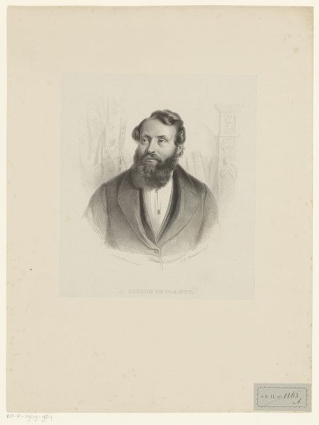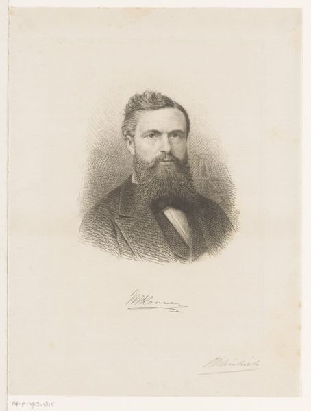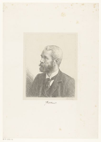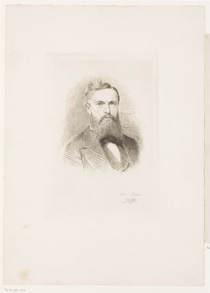 Here is the "Portrait of Max Rooses" by Jean Baptiste Pierre Michiels, an artwork held at the Rijksmuseum. In this print, the artist skillfully employs line and form to capture the likeness of Max Rooses. The composition is dominated by the figure’s head and shoulders, rendered with a delicate network of etched lines that define shape and texture. The density of lines varies, creating subtle tonal shifts that model the face and beard, giving them a tangible presence. The subject's gaze is direct and engaging. His face is framed by soft light and shadow. This creates a sense of depth and volume within the two-dimensional plane. The artist’s use of line is not merely descriptive. It functions almost as a semiotic code, with each stroke contributing to the overall characterization of the sitter. Ultimately, the effectiveness of this portrait lies in Michiels' masterful manipulation of line and form, a testament to the power of traditional printmaking techniques.