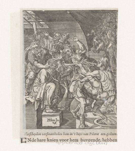 Curator: This engraving, dating from 1533, depicts a historical scene, “Pausanias Sitting on His Throne Receiving a Letter.” Editor: It's remarkably busy, isn’t it? A dense cluster of figures tightly arranged, and almost a playful contrast between the dark, strong lines and the almost cartoonish expressions of the characters. Curator: Right. What’s interesting is to think about who this image was for. Printed images like this, in the early 16th century, served as vital tools for disseminating news, ideas, and even propaganda across social classes. Here, a grand narrative from classical history is presented in accessible visual form. Editor: Visually, the composition is built upon strong diagonals – look at the line created by Pausanias’ legs, then by the weapons held by the soldiers, it’s like the letter brings an earthquake into his well-defended space. There's an imbalance at play, with the left side feeling somewhat crammed compared to the looser rendering on the right. The artist deliberately draws attention to Pausanias. Curator: Yes, Pausanias was a Spartan general, regent, who became entangled in plots of treason and conspiracy. So we see an interpretation of a key moment, carefully constructed. It reflects how power was performed and perceived in the 16th century and its connection with classical figures. Notice Pausanias, elevated on a throne. The posture and expression are not heroic, however, he's very human, very flawed, seemingly caught off guard. Editor: It's the stark contrast, perhaps. He’s powerful yet exposed, caught unawares. Technically speaking, it seems a crude and direct approach to contrasting these characters through tonal variation using very dark and almost scratchy lines. Curator: Considering the print’s original context really illuminates its significance. Beyond a mere historical record, it offered a visual language through which to reflect upon contemporary leadership and societal challenges, while also serving the purpose of illustrating classical authors. Editor: Precisely! A compelling visual statement for its time. It is interesting how so few and rough lines provide this intense atmosphere. Curator: Absolutely, and for me, the political aspect of these images always provides an endless field for investigation.