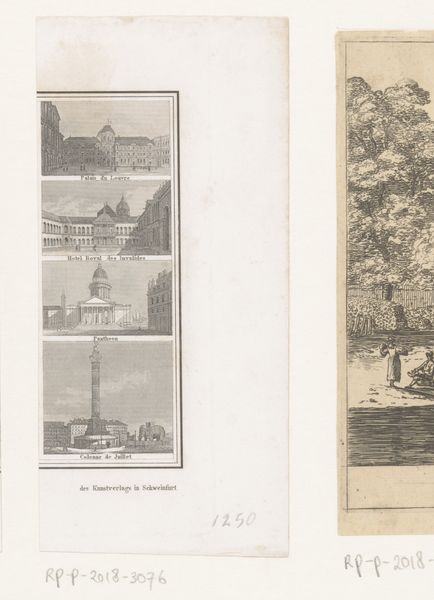 Editor: So, this is "Vier gezichten op plaatsen in Parijs," or "Four views of places in Paris," an engraving dating from around 1830 to 1850, by an anonymous artist. I’m immediately struck by the rigid organization of the scenes. How would you interpret this work, focusing on its formal elements? Curator: The arrangement is indeed key. Observe the sharp lines that delineate each Parisian scene, creating a grid-like structure. Notice, too, the contrast between the solid architectural forms and the more diffuse rendering of figures and landscapes. These compositional choices give it a restrained, almost classical feel. Editor: Do you see any significance in the order the scenes are presented? Does that arrangement suggest a particular narrative, or perhaps an emphasis on one space over another? Curator: Perhaps. The arrangement could subtly guide the viewer's eye. It appears, though, that the composition is more important than any implied narrative. Each vignette showcases meticulous detail within its frame, speaking more to the engraver's skill than the emotional weight of place. The interplay of line and tone is quite deliberate, and, I’d argue, the primary focus. How do you perceive the overall effect of that interplay? Editor: I see what you mean; it's as if the architecture and composition overshadow the context of Parisian life at that moment. The rigorous structure calls to mind precision, yet the details soften it with more expression. I now think the artistic structure is more telling. Thank you for helping me see it this way. Curator: A fresh eye can often uncover new insights. Indeed, focusing on the structure here unveils the artistic priorities evident in its time.