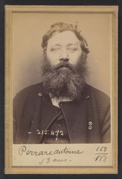 Curator: This photographic portrait, created by Alphonse Bertillon in 1894, is titled "Hourt. Jean. 34 (ou 35) ans, né à Reims (Marne). Menuisier. Anarchiste. 4/3/94." It’s currently held at the Metropolitan Museum of Art. Editor: It strikes me as both stark and intimate. There's an almost palpable weight in the sitter's gaze. Given the photographic method of the era, how was Bertillon dealing with capturing anarchists at this time? Curator: Bertillon's method, known as "Bertillonage," involved anthropometric measurements and photography as a way to identify and track individuals, primarily within the criminal justice system. Anarchists, viewed as threats to the social order, were certainly targets of such surveillance. We can think of the labor involved in photography in the late 19th century versus labor today in surveilling communities. Editor: Indeed. Consider the societal anxieties swirling around anarchist movements during that period. His labeling of the subject not just with his age and occupation, but also his political leaning— "Anarchiste"—effectively positions him as a threat. How much do you believe this representation may have had an impact? Curator: It definitely highlights how easily systems of identification can be weaponized. His occupation as a joiner is almost secondary, whereas that label ‘anarchist’ situates him firmly within a politically charged narrative. Photography becomes not a neutral recording, but a tool for constructing a specific image of this person, aligning him with danger and subversion. Editor: Absolutely. Let's talk about the materiality of the print. I wonder about the specific photographic process. The monochrome palette focuses the viewer so acutely on the subject’s face and the details of his attire; a certain wear to his coat or knot of his scarf, giving you a certain perspective on this individual. Curator: The choice of photography as the medium here reinforces the intention of empirical observation. We have to remember that Bertillon's process, while supposedly objective, was embedded within systems of power and prejudice. How did that effect the materials he selected? Editor: Yes, what’s represented and the means used to do it, particularly in bureaucratic record-keeping, were inherently enmeshed with political and societal structures. This image really encapsulates that tension between objective record and subjective interpretation. Curator: I find the work profoundly relevant. In considering the photograph, we're also invited to confront enduring questions of surveillance, power, and the representation of identity.